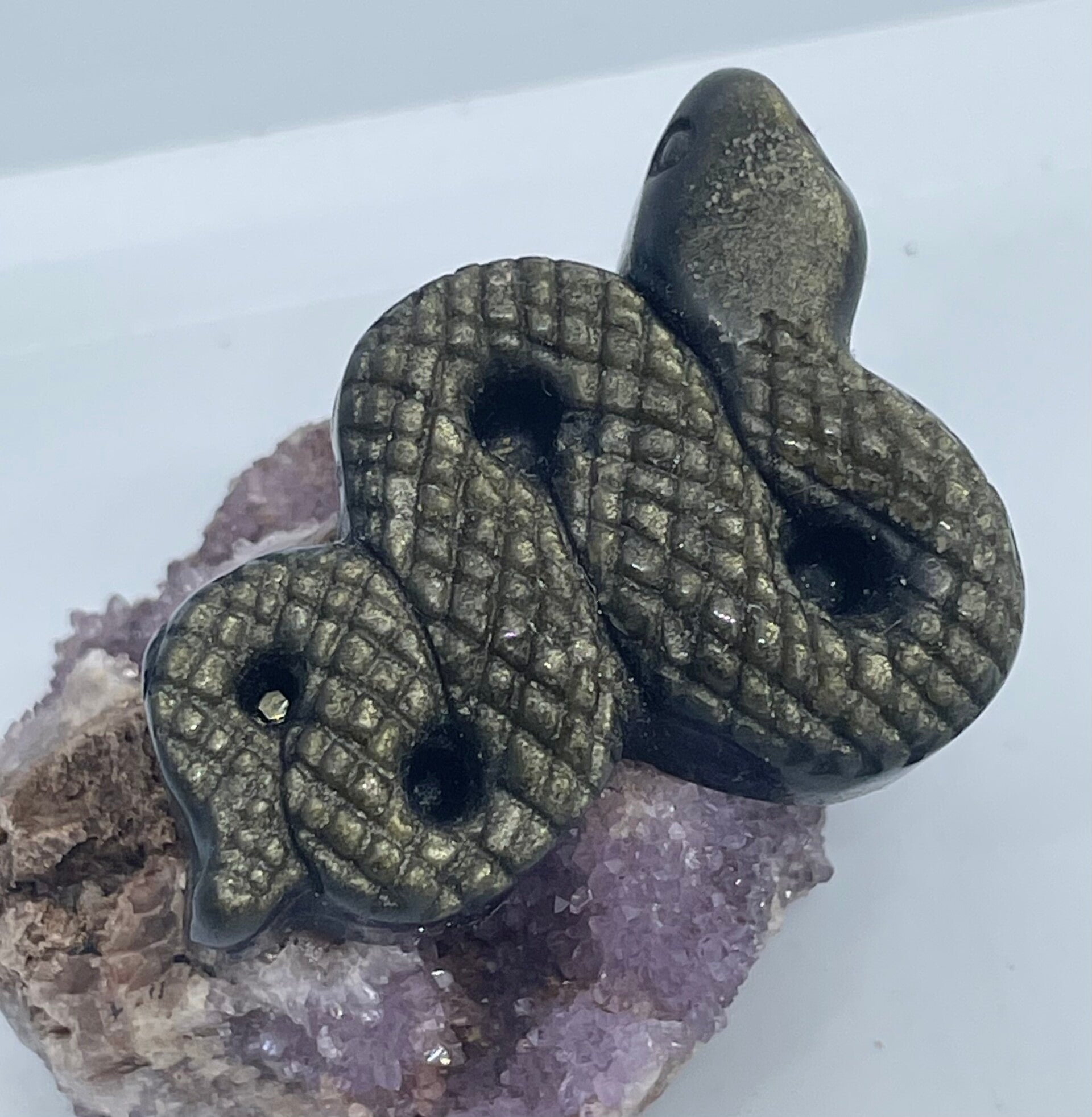 A gorgeous high quality gold sheen Obsidian snake carving with great detail and an amazing full coverage high sheen.